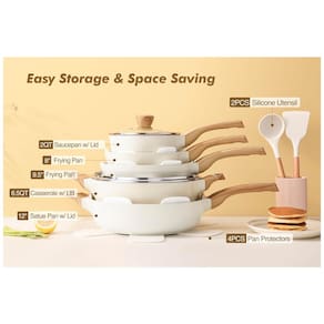 Componentes Inclusos: Conjunto de frigideiras, panela para refogar com tampa, caçarola com tampa, panela de 2 litros com tampa, 2 utensílios multiuso, 4 protetores de panela,