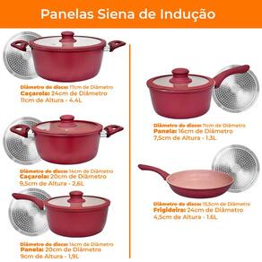 Composição: 1 Frigideira 24cm x 4,5cm - Disco de indução - 15cm Capacidade: 1,6L 1 Panela 16cm x 7,5cm - Disco de indução - 11cm Capacidade: 1.3L 1 Panela 20cm x 9cm - Disco de indução - 14cm Capacidade: 2,5L 1 Caçarola 20cm x 9,5cm - Disco de indução - 14,5cm Capacidade: 2.5L 1 Caçarola 24cm x 10,5cm - Disco de indução - 17cm Capacidade: 4.2L