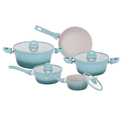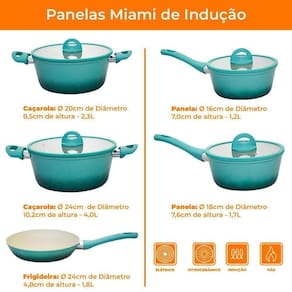 Design Exclusivo: O tom verde degradê Miami traz um toque vibrante e moderno para sua cozinha, transformando o ato de cozinhar em um momento especial. Material de Alta Qualidade: Confeccionadas com alumínio de 4,5 mm de espessura, as panelas garantem durabilidade e distribuição uniforme do calor, proporcionando resultados perfeitos em todas as suas receitas. Revestimento Antiaderente: Cozinhe de forma mais saudável e fácil com o revestimento antiaderente que evita que os alimentos grudem, facilitando a limpeza e economizando tempo. Tampas de Vidro Reto: As tampas de vidro temperado com borda de silicone permitem visualizar o cozimento dos alimentos sem a necessidade de removê-las, além de garantir um fechamento hermético. Cabos em Silicone: Os cabos em silicone proporcionam um manuseio seguro e confortável, mesmo em altas temperaturas. Versatilidade: Além de serem compatíveis com fogões de indução, as panelas também podem ser utilizadas em fogões a gás e elétrico, adaptando-se às suas necessidades. Conjunto Completo: O kit inclui uma caçarola de 20 cm, uma caçarola de 24 cm, uma panela de 18 cm, uma panela de 16 cm e uma frigideira de 24 cm, atendendo a todas as suas preparações. Benefícios: