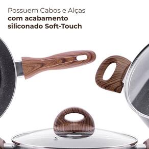 Os Cabos são em baquelite siliconado soft-touch com efeito amadeirado, o que evitará que esquentem durante o preparo de seus alimentos, e as tampas são feitas de vidro temperado com saídas para vapor e bordas em inox, ideais para você que gosta de sofisticação e elegância em sua cozinha.