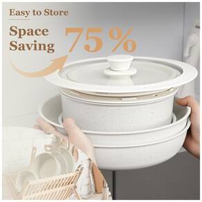 Design Compacto que Economiza Espaço: Com as alças removíveis, o conjunto de panelas e frigideiras permite um encaixe compacto e otimiza até 75% do espaço nos armários da cozinha. Isso ajuda a criar um ambiente de cozimento mais saudável e facilita o armazenamento, seja em armários ou até trailers.