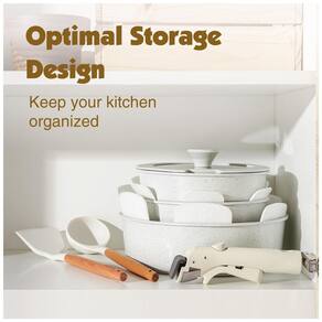 Armazenamento Fácil e Compacto: Com design empilhável e alças removíveis, este conjunto de panelas e frigideiras economiza até 70% de espaço. Ideal para armários ou até trailers, você pode organizar sua cozinha de maneira eficiente e sem ocupar muito espaço.