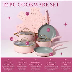 COZINHA COM ESTILO: O toque suave e as alças que permanecem frescas proporcionam conforto e controle enquanto sua criação culinária ferve. O revestimento antiaderente multicamadas permite fácil liberação e limpeza de alimentos. Salve sua manicure, não é necessário esfregar, pois este é um conjunto de panelas e frigideiras que pode ser lavado na máquina de lavar louça, a limpeza é simples.