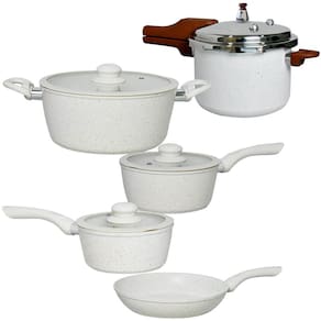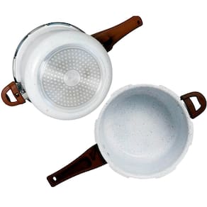 O kit de panelas da Rio Home é indicado para todos fogões, sejam eles a gás, indução, vitro-cerâmico ou elétrico. É composto por duas caçarolas, duas panelas com cabo, uma frigideira e uma panela de pressão todos em alumínio com revestimento cerâmicogranite.