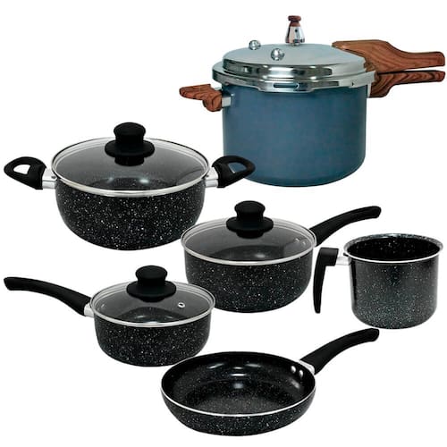 É composto por uma caçarola, duas panelas com cabo, uma frigideira, uma leiteira e uma penela de pressão, todos em alumínio com revestimento cerâmico na cor preta e granilites brancos.