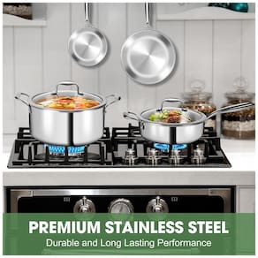 O Conjunto de Panelas em Aço Inoxidável de 3 Camadas com 11 Peças da EWFEN é a escolha perfeita para sua cozinha. Este conjunto inclui panelas e frigideiras com tampas de vidro temperado com bordas largas, garantindo versatilidade. Com tecnologia de múltiplas camadas, o interior em aço inoxidável 304 permite um cozimento seguro e fácil de limpar, o núcleo de alumínio garante aquecimento uniforme e o exterior em aço inoxidável 430 possibilita o uso em todos os tipos de fogões. Cada peça possui um design durável com acabamento espelhado, sendo seguro para máquina de lavar louça. As tampas de aço inoxidável selam a umidade e as alças rebitadas garantem manuseio seguro, enquanto permanecem frias durante o uso. Este conjunto é compatível com fogões a gás, elétricos, de indução e vitrocerâmicos, tornando-o versátil para qualquer cozinha. Os bicos moldados facilitam o despejo de caldos e molhos, enquanto os furos de drenagem integrados facilitam o escorrimento de massa e a separação de sólidos maiores.