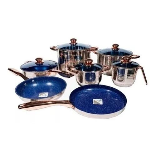 - Panelas de ótima qualidade Dsseldorf. - Peças em aço cirúrgico com revestimento ante aderente. - Usada pelos melhores chefes de cozinha do mundo. - Super luxuosa. - Cabo Rose Gold - Revestimento PFLUON em cor azul.