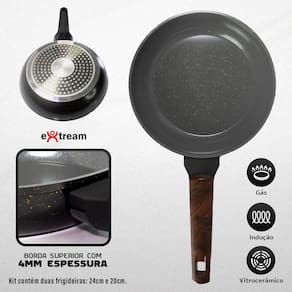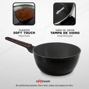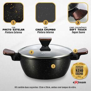 Jogo de Panelas Sampa Black Vulkano Extream - Tecnologia UltraShield Nano Ceramic e Compatibilidade com Fogão de InduçãoTransforme sua cozinha com o Kit de Panelas Sampa Black Vulkano Extream, desenvolvido para quem busca qualidade, durabilidade e inovação. Com um design moderno na cor Black Vulkano, este conjunto de 11 peças oferece tudo o que você precisa para um cozimento eficiente e prático.Funciona em TODOS os Tipos de Fogões, incluindo InduçãoGraças à sua base especial, este kit é totalmente compatível com fogões de indução, além de funcionar perfeitamente em fogões a gás, elétricos e vitrocerâmicos.Destaques do Produto:- Revestimento UltraShield Nano Ceramic Antiaderente - Tecnologia cerâmica avançada que impede que os alimentos grudem, proporcionando um cozimento mais saudável e facilitando a limpeza.- Alumínio Forjado de Alta Performance - Distribui o calor de maneira uniforme, garantindo um cozimento rápido e eficiente.- Kit Completo com 11 Peças - Inclui frigideiras, caçarolas, panelas, leiteira e utensílios essenciais para qualquer cozinha.- Durabilidade Extrema - Construído para resistir ao uso diário sem perder eficiência e beleza.- Design Sofisticado - A cor Black Vulkano traz um toque elegante e moderno para a sua cozinha.Itens Inclusos no Kit:1 Frigideira 20cm1 Frigideira 24cm1 Leiteira 14cm alumínio prensado 1 Panela 18cm1 Panela 20cm1 Caçarola 20cm1 Caçarola 22cm4 utensílios de cozinhaAposte na inovação da linha Black Vulkano e leve mais tecnologia para sua cozinha Marca: Não Informado