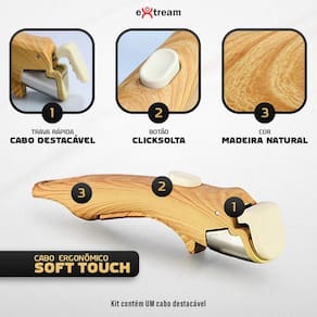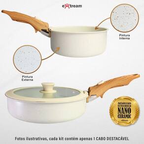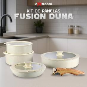 Jogo de Panelas Fusion Duna Extream - Cabo SmartClick e Compatível com Fogão de InduçãoO Kit de Panelas Fusion Duna Extream chegou para revolucionar sua cozinha Com um design sofisticado na cor Duna Bege , este conjunto de 10 peças traz praticidade, inovação e eficiência para o seu dia a dia.Funciona em Fogão por InduçãoO Kit Fusion Duna Extream é totalmente compatível com fogões de indução, além de ser ideal para uso em fogões a gás, elétricos e vitrocerâmicos.Destaques do Produto:- Cabo Destacável SmartClick - Mais praticidade e segurança Facilita o armazenamento, economiza espaço e permite levar as panelas diretamente do fogão ao forno ou à mesa.- Tampas de Plástico para Armazenamento Inteligente - Guarde as sobras das refeições diretamente na panela, mantendo os alimentos frescos por mais tempo.- Revestimento UltraShield Nano Ceramic Antiaderente - Tecnologia cerâmica avançada que impede que os alimentos grudem, tornando o preparo mais saudável e facilitando a limpeza.- Alumínio de Alta Performance - Proporciona um cozimento uniforme, rápido e eficiente.- Versatilidade Total - Use no fogão, no forno sem o cabo , na geladeira e até na mesa para servir com estilo.Itens Inclusos no Kit:1 Frigideira 20cm1 Frigideira Alta 26cm1 Panela 18cm1 Panela 20cm3 Utensílios de Cozinha1 Cabo Destacável SmartClick1 Tampa Plástica 18cm1 Tampa Plástica 20cmAposte na praticidade do cabo destacável, no armazenamento inteligente e na compatibilidade com fogões por indução Marca: Não Informado