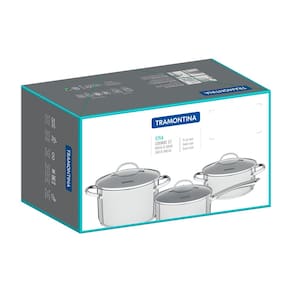 Especificações Gerais do Produto: Pegador / Cabo: Inox Dimensões AxLxP (mm): Caçarola funda Ø 20cm; Caçarola Ø 24cm; Panela Ø 16cm Cor: Aço Inox Material: Aço Inox e Vidro Temperado Garantia: 90 dias junto ao fabricante Referência: 65280300 Tecnologia da Panela: Fundo Triplo Pode ir à Máquina de Lavar Louças?: Sim Capacidade da Panela: Caçarola funda 3,60L; Caçarola 4,80L; Panela 1,40L Linha: Una Tipo de Fogão: Gás, elétrico, vitrocerâmico e indução Tampa: Panela e caçarolas: sim, de vidro com saída de vapor