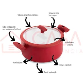 Características: Espessura de 3 milímetros, tampa de vidro com acabamento em silicone, além de muito bonita causa impressão de sofisticação na cozinha. Os cabos em silicone soft touch dão maciez e estabilidade no manuseio da panela além de serem isotérmicos e não esquentarem. O Interior antiaderente em cerâmica facilita o preparo e a limpeza além de não liberar componentes tóxicos na preparação dos alimentos, a construção da panela com fundo especial possibilita sua utilização.