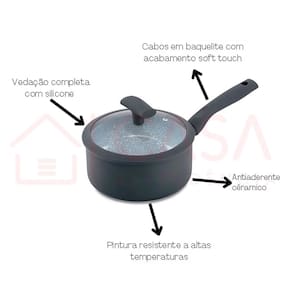 Características: Espessura de 3 milímetros, tampa de vidro com acabamento em silicone, além de muito bonita causa impressão de sofisticação na cozinha. Os cabos em silicone soft touch dão maciez e estabilidade no manuseio da panela além de serem isotérmicos e não esquentarem. O Interior antiaderente em cerâmica facilita o preparo e a limpeza além de não liberar componentes tóxicos na preparação dos alimentos, a construção da panela com fundo especial possibilita sua utilização.