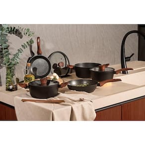 Produzido em alumínio de alta qualidade, o conjunto garante aquecimento rápido e distribuição uniforme do calor. O revestimento cerâmico Mineral Resist, com partículas de cerâmica, oferece excelente antiaderência, maior durabilidade e permite cozinhar com menos óleo, facilitando a limpeza.