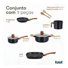 Leiteira 14x12 cm – 1630 ml Panela 16x7,5 cm – 1400 ml Panela 18x8 cm – 1800 ml Caçarola 18x9 cm – 1900 ml Caçarola 20x9 cm – 2600 ml Frigideira 16x4 cm – 420 ml Frigideira 20x4,5 cm – 680 ml