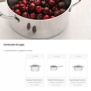 Cozinhar é um dos prazeres da vida, mas saborear pratos com aroma e sabor incomparáveis é melhor ainda E para que isso seja possível, a Tramontina lança o Jogo de Panelas Tramontina Una em Aço Inox com Fundo Triplo e Tampas de Vidro 3 Peças. Todas as peças são produzidas em aço inox com acabamento alto brilho e fundo triplo aço inox + alumínio + aço inox , que distribui o calor uniformemente, proporcionando um cozimento mais rápido e uniforme, economizando energia e deixando os alimentos aquecidos por mais tempo. Possuem tampa de vidro com saída de vapor e encaixe perfeito, e podem ser lavadas diariamente na máquina de lavar louças. Tenha produtos Tramontina e garanta satisfação nos momentos na cozinha Informações Gerais Mais saudável: por ser feita de aço inoxidável, a caçarola Tramontina não libera nenhum tipo de resíduo nas suas receitas. Fácil de usar: uma caçarola prática para todas as suas receitas e que faz bonito em qualquer tipo de fogão: gás, elétrico, vitrocerâmico e indução. Tampa de vidro com saída de vapor e encaixe perfeito. Mais durável: o inox Tramontina é uma matéria-prima nobre, resistente e que vai fazer bonito por muito mais tempo na cozinha. Economiza tempo e energia: o segredo está no fundo triplo aço inox + alumínio + aço inox , que distribui o calor uniformemente, proporcionando um cozimento mais rápido. Por isso, você pode manter o fogo baixo durante todo o preparo e, assim, poupar energia. Fácil de limpar: deixar sua caçarola brilhando é simples, você só precisa de água, sabão e uma esponja macia. Se preferir, é só colocar na máquina de lavar. Marca: Não Informado Ean: 7891116149089