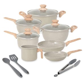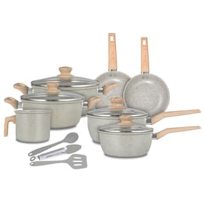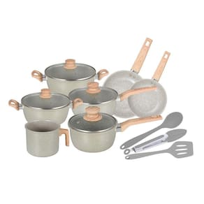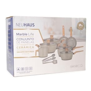 O kit inclui uma variedade de peças funcionais para diferentes tipos de receitas: duas caçarolas com tampa, duas panelas com tampa, uma leiteira, duas frigideiras e três utensílios em silicone Colher, espátula e pegador Que preservam o revestimento das peças. Com um design moderno e acabamento marmorizado em cores sofisticadas, o conjunto também valoriza a decoração da cozinha.