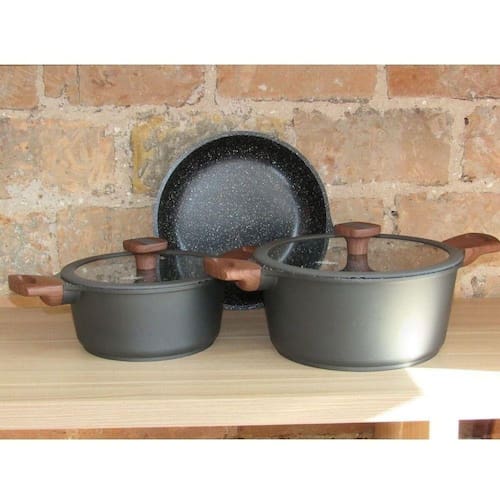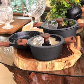 Conjunto de Panelas Titanium 3 Peças MTA Nova Linha de Panelas Titanium MTA, Composta por Tres Peças, Sendo Duas Caçarolas e Uma Frigideira. Inovação e Tecnologia Juntas Resume Em Um Belo e Requintado Conjunto de Panelas. Características: Marca: Mta Material: Alumínio Injetado Espessura: 5mm Fogões: a Gás, Eletrônico, vitrocerâmico e indução Possui tampa de vidro temperado Saída para vapor Cabos Soft-Touch Pode ser utilizado em lava louças Revestimento Cerâmico Marmorizado Composição: Caçarola 24 Cm De 4,3 Litros, Tampa de Vidro Temperado Com Anel de Silicone e Pegadores Soft-Touch Caçarola 20 Cm De 2,4 Litros, Tampa de Vidro Temperado Com Anel de Silicone e Pegadores Soft-Touch Frigideira 24 Cm 1,9 Litros, Pegadores Soft-Touch Compre agora mesmo seu Jogo de Panelas Titanium, um jogo de alta qualidade, seu corpo de alumínio injetado com 5mm de espessura traz uma enorme robustez e durabilidade ao produto. Seu interior revestido com cerâmica marmorizada traz toda a qualidade dos revestimentos de cerâmica, trazendo maior sabor para a comida e praticidade á quem utiliza. Seu revestimento cerâmico marmorizado juntamente com a madeiras de seus cabos proporcionam um design robusto que combina com qualquer tipo de cozinha seja moderna ou tradicional.