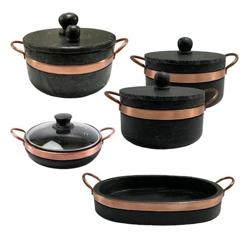 Jogo De Panelas Pedra Sabão 05 Peças - 1 Pressão 4 Litros, 2 Caçarola 3 Litros, Frigideira 20 Cm E Assadeira Grande Transforme Sua Cozinha com o Autêntico Jogo de Panelas de Pedra Sabão!Descubra o segredo das gerações para cozinhar de forma saudável, eficiente e cheia de sabor. Nosso exclusivo Jogo de Panelas de Pedra Sabão é meticulosamente esculpido à mão por artesãos locais, combinando tradição milenar com design moderno. Cada peça é única, feita para realçar os sabores naturais dos seus alimentos e garantir uma experiência culinária sem ção de Calor Superior: Cozinhe em uma temperatura constante por mais tempo, economizando energia e mantendo os alimentos aquecidos na mesa.Versatilidade: Ideal para assar, grelhar, cozinhar ou simplesmente servir, nossas panelas são seguras para usar no forno, fogão e churrasqueira.Cozinha Saudável: Minimiza a necessidade de óleo ou gordura, promovendo uma alimentação mais saudável sem sacrificar o sabor.Durabilidade: A pedra sabão é conhecida por sua resistência e durabilidade, garantindo que seu investimento dure geraçõácil de Limpar: Com tratamento natural antiaderente, a limpeza é simples e rápida. O Que Está Incluído:- 01 Panela de pressão 4 litros- 02 Panelas de Pedra 3 litros;- 01 Assadeira / Lasanheira de Pedra Grande;- 01 Frigideira 20 cm