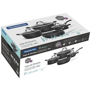Jogo de Panelas Preto 4 Peças Mônaco Induction Tramontina Para fogões com aquecimento por indução, a Tramontina apresenta a linha Mônaco Induction. Peças de diferentes modelos e tamanhos, e propostas com a qualidade do revestimento antiaderente Starflon Premium. A modernidade e a elegância são combinadas para preparar as suas melhores receitas. Composição: 1 - Caçarola 24 cm 4,5 L. 1 - Frigideira funda 24 cm 2,7 L. 1 - Panela 20 cm 2,6 L. 1 - Panela 18 cm 2,0 L. Como usar o produto A capacidade volumétrica máxima para cozimento é de 3/4 da capacidade total da peça. Posicione os cabos dos utensílios voltados ao centro do fogão. Em fogões com grade, centralize a peça e alinhe o cabo com a grade. Utensílios quentes devem estar fora do alcance das crianças. Este produto não pode sofrer modificações. Antes do primeiro uso, lave com esponja macia, sabão neutro ou detergente líquido. Depois de secar, unte a área interna com óleo ou gordura e leve ao fogo por um ou dois minutos. Deixe esfriar e lave novamente. Seu utensílio Starflon está pronto para uso com ou sem gordura, sempre em fogo baixo ou médio (nunca superior a 350ºC). Para mexer os alimentos use somente utensílios de silicone, nylon ou madeira. Evite a imersão do utensílio quente em água fria. Nunca utilize produtos abrasivos na lavagem. Se deixar queimar alimentos, umedeça a área e reserve até que possa remover os resíduos grudados com esponja e sabão. Para descarte dos produtos e embalagens siga as orientações de reciclagem vigentes. Este produto não necessita de manutenção, apenas limpeza. Corpo de alumínio com espessura de 3,0 mm que proporciona cozimento rápido e uniforme. Revestimento interno e externo de antiaderente Starflon Premium que não gruda, é fácil de limpar, mais durável e não é prejudicial a saúde. Tampa de vidro temperado com borda de aço inox e saída de vapor. Cabos, alças e pegadores metálicos com proteção de silicone que proporciona redução da propagação de calor, aumentando a segurança e melhorando a empunhadura. Podem ir à máquina de lavar louças facilitando seu dia a dia. Especificação técnica: EAN13: 7891112281080 DUN14: 17891112281087 NCM: 7615.10.00 Peso Líquido: 5,0600 kg. Peso Bruto: 6,3600 kg. Metragem: 0,048265 m³. Cor 1: 000000 Hexa