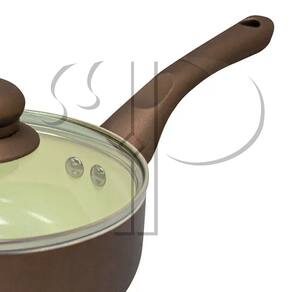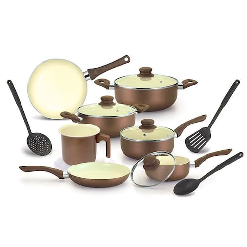 Com 1 Leiteira, 2 Frigideiras, 2 panelas, 2 Caçarolas e 3 Utensílios. Roma cor Marrom com interno antiaderente cerâmico na cor bege. Não gruda. Em alumínio, com 1,8mm de espessura. Servem para fogões à gás e elétrico. Cabos e alças siliconadas resistentes ao calor combinando com a cor do conjunto. Tampas em Vidro Temperado com saída de vapor e bordas em aço inoxidável. Fácil de limpar, podem ir à lava-louças. Excelente para ter em casa e presentear.