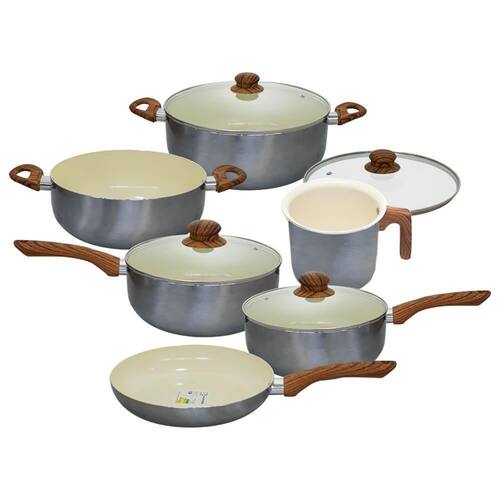 O conjunto é composto por 6 peças na cor prata com alças e cabos com design de madeira. São duas caçarolas, duas panelas com cabo, uma frigideira e uma leiteira, um kit completo que facilitará o cozimento no dia a dia.