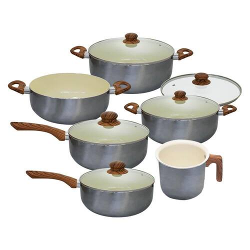 O conjunto é composto por 6 peças na cor prata com alças e cabos com design de madeira. São três caçarolas, duas panelas com cabo e uma leiteira, um kit completo que facilitará o cozimento no dia a dia.