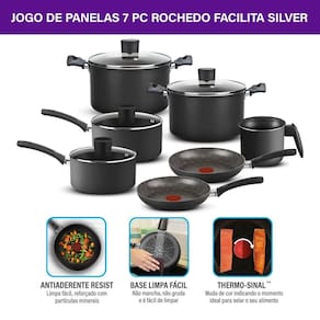 Linha Rochedo Facilita, com antiaderente Resist Limpa fácil, reforçado com partículas minerais: Dura mais. Com o Jogo de Panelas Rochedo Facilita Cinza 7 Peças, você facilita seu dia a dia, composto por Frigideira 18cm, Caçarola 20cm, Caçarola 24cm, Panela 16cm, Panela 18cm, Frigideira 20cm, Fervedor 12cm, é o item ideal para sua cozinha. Conheça todos os diferenciais dessa linha: