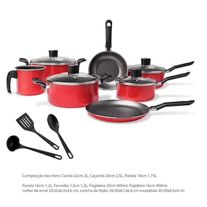 Carola 22cm 3L || Caçarola 20cm 2,5L || Panela 18cm 1,75L || Panela 16cm 1,2L, || Fervedor 12cm 1,2L, || Frigideira 20cm 800ml, || Frigideira 16cm 400ml, || colher de arroz 29,5x6,5x3,6 cm, || Concha de feijão 28,5x8,7x6,8 cm || Espátula 30,5x8,5x4 cm