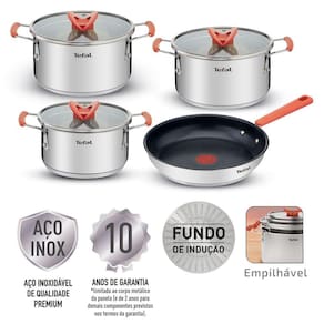 A linha Tefal OptiSpace facilita o armazenamento e otimiza espaço na sua cozinha, além de contar com toda a elegância e resistência do Inox de qualidade premium e oferecer 10 anos de garantia*!