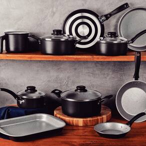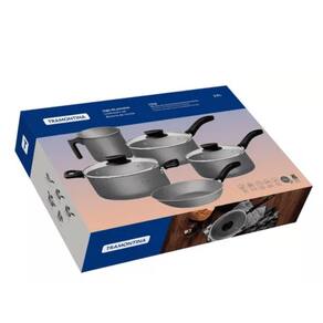 Aprimore sua cozinha com o jogo de panelas Tramontina Linz em alumínio com revestimento interno e externo em antiaderente Starflon Max preto 5 peças. Essenciais para quem não abre mão da funcionalidade na cozinha, este jogo tem peças que evitam que os alimentos grudem, mesmo cozinhando de maneira rápida e uniforme. Tudo isso, graças a produção em alumínio com revestimento interno e externo e Starflon Max. As tampas de vidro temperado com bordas de aço inox permitem acompanhar o preparo com segurança, e os cabos e alças de baquelite antitérmico, junto com os pegadores de nylon, oferecem conforto e segurança no manuseio. Além de todas essas características, o jogo pode ir em fogões a gás, elétricos e vitrocerâmicos, é lavável em máquina de lavar louças, e proporcionará toda a praticidade ao seu dia a dia na cozinha Composição 1 Caçarola 20 cm 2,8 L; 1 Fervedor 12 cm 1,1 L ; 1 Frigideira 20 cm 0,8 L; 1 Panela 16 cm 1,4 L; 1 Panela 18 cm 2 L. Marca: Não Informado