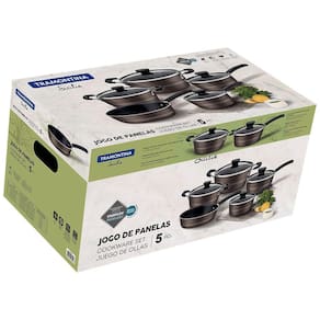 Características: Marca: Tramontina Modelo: Sicília Tipo: Jogo de panelas Quantidade de panelas: 5 panelas Material: Alumínio Revestimento externo: Antiaderente starflon Revestimento interno: Antiaderente starflon Tampa: Vidro temperado Cabo: Baquelite antitérmico Alças: antitérmico Pegador: Nylon Possui utensílio: Não Código de barras 7891112279056