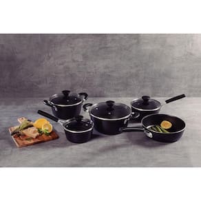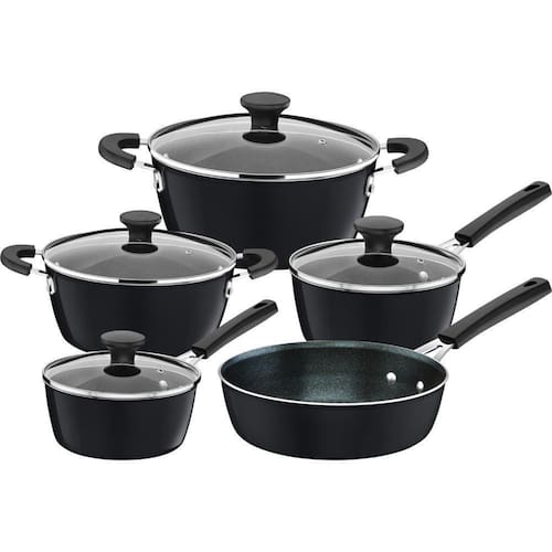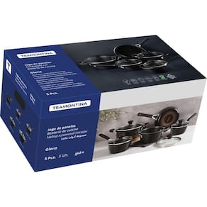 Com o Jogo de Panelas Tramontina Glenz, você terá em mãos um conjunto de alta qualidade que vai transformar a sua cozinha. Composto por 5 peças, as panelas são desenvolvidas com corpo de alumínio com espessura que proporciona cozimento rápido e uniforme, e revestimento interno de antiaderente Starflon Crystals, que não gruda, é fácil de limpar, mais durável e não prejudica a sua saúde. Além disso, as panelas têm revestimento externo esmaltado na cor cinza stone, oferecendo uma estética moderna e elegante à sua cozinha. As tampas de vidro temperado com saída de vapor e bordas de aço inox permitem a visualização dos alimentos durante o cozimento e garantem maior segurança na hora de manusear. Os cabos, alças e pegadores de baquelite antitérmico oferecem segurança durante o manuseio, pois não aquecem. E para facilitar ainda mais a sua vida, as panelas podem ser levadas à máquina de lavar louças Características: Marca: Tramontina Código do Fabricante: 28699610 Linha: Glenz Cor: Cinza Stone Material: Alumínio Material das Alças/Pegadores: Baquelite antitérmico Antiaderente: Sim Fogões Compatíveis: Gás, elétrico e vitrocerâmico Conteúdo do Jogo: 1 Caçarola 20cm 2.8L, 1 Caçarola 24cm 4.1L, 1 Frigideira Funda 24cm 2.8L, 1 Panela 16cm 1.3L e 1 Panela 18cm 1.8L Compatível com Lava-louças: Sim Material das Tampas: Vidro Temperado Saída de Vapor: Sim