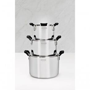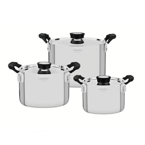 Perfeita para você que quer aproveitar seu espaço, o Jogo de Panelas Grano Compact em Aço Inox com Corpo Triplo e Alças em Silicone Preto 3 Peças Tramontina é a escolha ideal, pois as panelas podem ser inseridas uma dentro da outra. Fabricadas em aço inox, possuem o corpo triplo, alças e pegadores com revestimento em silicone antitérmico. O jogo pode ir em qualquer tipo de fogão: seja a gás, elétrico, vitrocerâmico ou por indução. Sua cozinha merece contar com a beleza e versatilidade das panelas Tramontina!