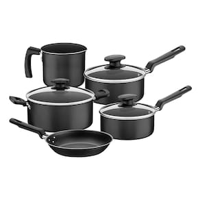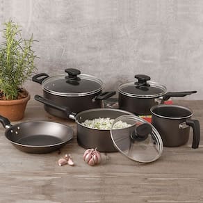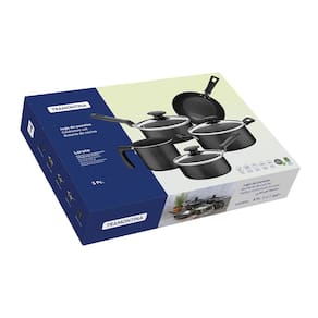 Especificações Gerais do Produto: Pegador / Cabo: Baquelite Antitérmico Dimensões AxLxP (mm): Caçarola Ø 20cm; Fervedor Ø 12cm; Frigideira Ø 20cm; Panela Ø 16cm; Panela Ø 18cm Cor: Grafite Material: Alumínio e baquelite Garantia: 90 dias junto ao fabricante Referência: 20399082 Tecnologia da Panela: Starflon Max Pode ir à Máquina de Lavar Louças?: Sim Capacidade da Panela: Caçarola 2,8L; Fervedor 1,1L; Frigideira 0,8L; Panela 1,4L; Panela 2L Linha: Loreto Revestimento Interno: Antiaderente Tipo de Fogão: Gás, elétricos e vitrocerâmicos (resistência elétrica) Tampa: Panelas e caçarola: sim, de vidro com saída de vapor