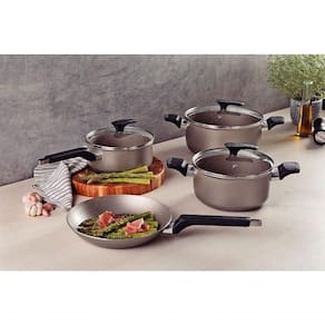 O jogo de panelas Tramontina Milazzo antiaderente 4 peças é ideal para quem busca mais conforto e agilidade no preparo das refeições. Produzido em alumínio com revestimento interno e externo Starflon Max, contribui para uma limpeza rápida e evita que os alimentos grudem, mesmo com pouco uso de óleo. Os cabos e alças de baquelite antitérmico com acabamento soft-touch garantem no manuseio, mesmo com o uso contínuo. As tampas de vidro temperado com saída de vapor permitem acompanhar o cozimento sem perder temperatura. com fogões a gás, elétrico e vitrocerâmico, o Tramontina Milazzo é uma escolha versátil e eficiente para cozinhas que valorizam qualidade e praticidade.