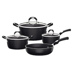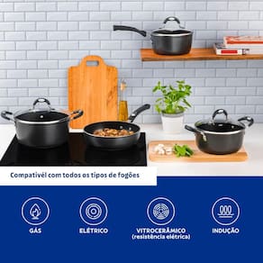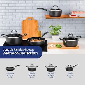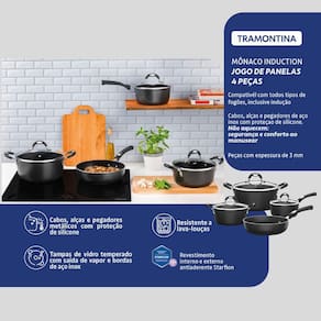 O jogo de panelas Tramontina Mônaco Induction em alumínio com revestimento interno e externo antiaderente Starflon Premium preto 4 peças é a escolha ideal para quem preza por utensílios de alta qualidade em sua cozinha! Suas peças tem corpo produzido em alumínio com espessura de 3 milímetros que proporcionam um cozimento rápido e uniforme dos alimentos. Seu revestimento interno e externo é em antiaderente Starflon Premium, que não gruda, é fácil de limpar, mais durável e não é prejudicial a sua saúde e da sua família. Suas panelas e caçarola acompanham tampa de vidro temperado com saída de vapor e borda de aço inox que auxilia no preparo dos alimentos e facilita a visualização. Seus cabos, alças e pegadores são metálicos com proteção de silicone que reduz a propagação de calor, garantindo um manuseio muito mais seguro e confortável. As peças ainda são fáceis limpar e podem ir à máquina de lavar louças, facilitando seu dia a dia. Com a Tramontina, você tem o melhor para equipar sua casa!