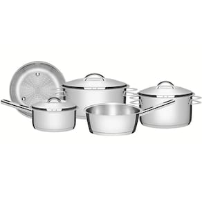 Nada como produtos duráveis e práticos na nossa cozinha. Com o jogo de panelas Tramontina Solar em inox 5 peças você vai ter itens funcionais perfeitos para auxiliar você nas tarefas do dia a dia. Totalmente produzidas em aço inox, as cinco peças mantém os alimentos saudáveis já que o material não solta resíduos. Trazem ainda a tecnologia de fundo triplo (aço inox + alumínio + aço inox) que distribui o calor uniformemente, proporcionando um cozimento mais rápido e uniforme, economizando energia e deixando os alimentos aquecidos por mais tempo. São peças versáteis que podem ir ao forno para gratinar ou finalizar pratos na temperatura máxima de 260C e ser utilizadas em diferentes tipos de fogões. São fáceis de limpar devido ao desenho sem cantos, além de poderem ir à máquina de lavar louças diariamente. Faça sua cozinha mais completa com esse jogo de panelas clássico da Tramontina!