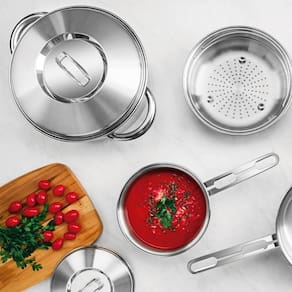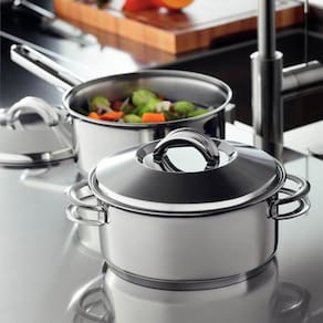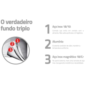 - Economiza tempo e energia: o segredo está no fundo triplo que distribui o calor uniformemente, proporcionando um cozimento mais rápido. Por isso, você pode manter o fogo baixo durante todo o preparo e, assim, poupar energia. Além disso, a panela toda em aço inox pode ir ao forno para gratinar ou finalizar pratos, na temperatura máxima de 260C;