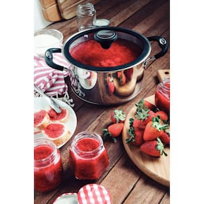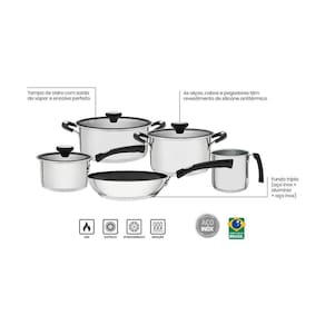 Jogo de Panelas Tramontina Solar Silicone em Aço Inox com Fundo Triplo 5 Peças Cor: Prateado O jogo de panelas Tramontina Solar Silicone em aço inox com fundo triplo 5 peças é a escolha perfeita para garantir o sucesso de todas as suas refeições e deixar sua cozinha ainda mais completa. Suas peças são desenvolvidas em aço inox e contam com fundo triplo (aço inox + alumínio + aço inox), características que juntas, as tornam altamente duráveis e proporcionam o cozimento dos alimentos de maneira rápida e uniforme. O jogo pode ser utilizado em diversos tipos de fogões, é fácil de limpar e vai otimizar sua rotina na cozinha Conteúdo da Embalagem:- 1 Caçarola Rasa 24cm 4,7 Litros Solar silicone- 1 Caçarola Funda 20 cm 3,6 Litros- 1 Panela 16 cm 1,80 Litros- 1 Frigideira 24 cm 2,10 Litros- 1 Fervedor 14 cm 2,0 Litros Mais saudável: por ser feita de aço inoxidável, a panela Tramontina não libera nenhum tipo de resíduo nas suas receitas. Fácil de usar: uma panela prática para todas as suas receitas e que faz bonito em qualquer tipo de fogão: gás, elétrico, vitrocerâmico e indução. tampa de vidro com saída de vapor e encaixe perfeito. As alças, cabos e pegadores tem revestimento em silicone antitérmico tornando a pega mais macia e confortável. Mais durável: o inox Tramontina é uma matéria-prima nobre, resistente e que vai fazer bonito por muito mais tempo na cozinha. Economiza tempo e energia: o segredo está no fundo triplo (aço inox + alumínio + aço inox), que distribui o calor uniformemente, proporcionando um cozimento mais rápido. Por isso, você pode manter o fogo baixo durante todo o preparo e, assim, poupar energia. Fácil de limpar: deixar sua panela brilhando é simples, você só precisa de água, sabão e uma esponja macia. Se preferir, é só colocar na máquina de lavar. A capacidade volumétrica máxima para cozimento é de 3/4 da capacidade total da peça. Antes de utilizar o produto, remover as eventuais etiquetas e lavar com água quente e detergente. Use uma fonte de calor brando para evitar que o alimento grude no fundo da panela. O fundo triplo distribui uniformemente o calor, não sendo necessário o fogo alto. E, além disso, você economiza energia. Quando a panela for utilizada no fogão a gás, a chama não deve ultrapassar a base da panela. No caso de uso de chapa elétrica, a chapa deverá ter diâmetro igual ou inferior ao da panela. Sempre dissolva o sal em água fervendo ou com os alimentos, mexendo os ingredientes no início do cozimento. Não aqueça o alimento colocando uma panela do mesmo diâmetro sobre a outra. Esse procedimento é perigoso, pois cria vácuo e impossibilita a retirada do mesma. Se a tampa da panela de aço inox Tramontina ficar presa pelo efeito do vácuo durante o resfriamento, basta puxar ou aquecer novamente até neutralizar o efeito do vácuo. O cabo de inox aquece durante o cozimento. Aconselhamos o uso de luvas durante o manuseio. Alguns alimentos que possuem amido, como massa e arroz, poderão deixar manchas na parte interna da panela durante o cozimento. Para remover facilmente as manchas, passe um pano umedecido com suco de limão ou vinagre, ou use a Pasta para Polir e Remover Manchas Tramontina.