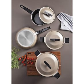 Dê um toque de sofisticação à sua cozinha com o jogo de panelas Tramontina Spezia Induction em alumínio com revestimento interno e externo em antiaderente Starflon Excellent areia 4 peças. O revestimento antiaderente Starflon Excellent facilita a limpeza e evita que os alimentos grudem, suas peças oferecem um cozimento uniforme. Os cabos em baquelite com acabamento soft-touch garantem conforto e segurança. Versátil, o conjunto é compatível com fogões a gás, elétrico, vitrocerâmico e de indução, perfeito para tornar o dia a dia mais prático.