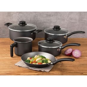 Para preparar suas refeições com maior praticidade e qualidade, o jogo de panelas Tramontina Turim em alumínio com revestimento interno e externo em antiaderente Starflon Max Cinza 5 peças é a escolha perfeita! Suas peças vão lhe garantir um cozimento rápido e uniforme dos alimentos, pois são produzidas em alumínio. O revestimento interno e externo é em antiaderente Starflon Max, material que evita que os alimentos grudem nas superfícies, é fácil de limpar, mais durável e não é prejudicial a saúde. Para um manuseio mais seguro, os cabos e alças são em material antitérmico que não aquece. Além disso, as panelas e caçarola vem acompanhadas de tampas de vidro temperado com bordas de aço inox, que auxiliam e facilitam o preparo das suas receitas. Elas ainda são muito práticas e podem ir à máquina de lavar louças, proporcionando facilidade em seu dia!