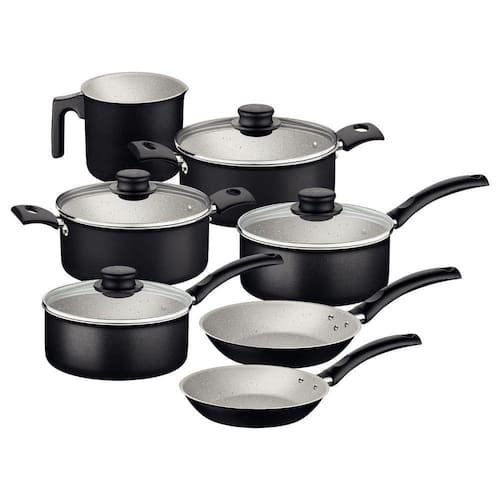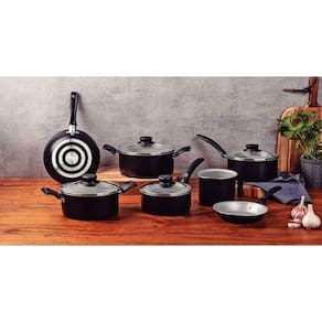 Jogo De Panelas Tramontina Turim 7 Peças Em Alumínio Antiaderente Starflon Max Preto Quem não abre mão de alta qualidade na cozinha e deseja praticidade durante o preparo das suas refeições, precisa contar com o jogo de panelas Tramontina Turim em alumínio com revestimento interno e externo em antiaderente Starflon Max preto 07 peças. Composto por panelas, caçarolas, frigideiras e fervedor, ele é um jogo desenvolvido em alumínio com espessura especial e revestimento em antiaderente Starflon. Devido a essas características, as peças cozinham os alimentos de maneira rápida e uniforme, sem que eles grudem em sua superfície; garantindo também maior resistência, durabilidade e facilidade na limpeza. As panelas e caçarolas vem com tampas de vidro temperado com bordas de aço inox e pegadores de nylon e todos os itens contam com cabos ou alças em baquelite antitérmico, material que não aquece e proporciona um manuseio confortável e seguro. Além de todas essas características, as peças do jogo podem ser levadas à máquina de lavar louças e utilizadas em fogões a gás, elétricos e vitrocerâmicos - resistência elétrica. Escolha Tramontina e transforme seu dia a dia na cozinha! Linha/Coleção - Turim Garantia do fabricante - 12 Material - Alumínio Cor - Preto Acabamento - Preto Tampa(s) - Vidro Alças e Cabos - Baquelite Quantidade de Peças - 7 Revestimento Interno - Antiaderente Starflon Max Revestimento Externo - Antiaderente Starflon Max Cabo perfurado - Sim Fundo triplo - Não Composição - 1 Caçarola 18 cm 2 L;1 Caçarola 20 cm 2,8 L;1 Fervedor 12 cm 1,1 L;1 Frigideira 16 cm 0,4 L;1 Frigideira 20 cm 0,8 L;1 Panela 16 cm 1,4 L;1 Panela 18 cm 2 L; Tampa(s) com saída de de vapor - Sim Podem ser utilizadas nos fogões - Gás, Elétrico e Vitrocerâmico É adequado para lava-louças - Sim Marca - Tramontina Mais Informações - Corpo de alumínio com espessura que proporciona cozimento rápido e uniforme.Revestimento interno e externo de antiaderente Starflon Max que não gruda, é fácil de limpar, mais durável e não é prejudicial à saúde, pois é livre de PFOA.Tampas de vidro temperado com borda de aço inox.Cabos, alças de baquelite antitérmico e pegadores de nylon que oferecem segurança durante o manuseio.Podem ir à máquina de lavar louças facilitando seu dia a dia. Recomendações de Uso - A capacidade volumétrica máxima para cozimento é de 3/4 da capacidade total da peça.Posicione os cabos dos utensílios voltados ao centro do fogão.Em fogões com grade, centralize as peças sobre a chama ou fonte de calor e alinhe os cabos com a grade.Utensílios quentes devem estar fora do alcance das crianças.Para descarte dos produtos e embalagem siga as orientações de reciclagem vigentes. Certificação - 0040 - SGS Peso - 3,05 kg Garantia - 3 meses para vícios ou defeitos de fabricação EAN - 7891112332966 Ean: 7891112332966
