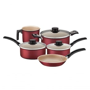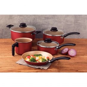 Com o jogo de panelas Tramontina Turim em alumínio com revestimento interno e externo em antiaderente Starflon Max vermelho 5 peças você vai ter a melhor opção para preparar suas receitas com praticidade e qualidade. Desenvolvidas para uso diário, as peças são produzidas em alumínio com revestimento interno e externo em antiaderente Starflon Max, características que proporcionam um cozimento rápido e uniforme dos alimentos, evitam que eles grudem na superfície, as tornam fácil de limpar e não prejudiciais a sua saúde. Os cabos e alças são em baquelite e os pegadores das tampa em nylon, materiais que não aquecem e proporcionam um manuseio muito mais confortável e . Um jogo durável, que pode ser lavado na máquina de lavar louças e que acompanha tampas de vidro temperado com bordas de aço inox, que auxiliam e facilitam o preparo das receitas!