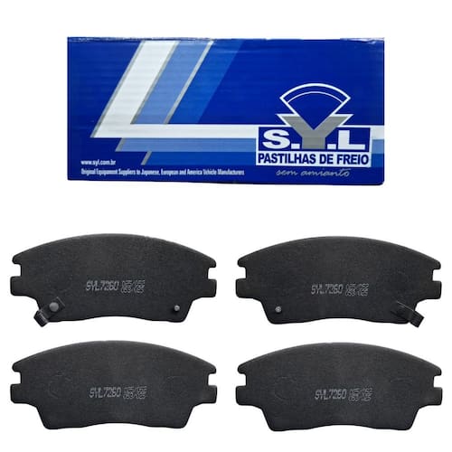 Jogo de pastilhas de freio dianteiras SYL7260, um componente essencial para a reposição no sistema de freios. Esta peça é projetada para ser compatível com o Kia Sportage 2.0 a partir do ano de 2017 e com o Hyundai New Tucson 1.6 16V, também a partir de 2017 em diante. Confirma a aplicação nas rodas dianteiras para garantir o desempenho de frenagem adequado nestes modelos específicos.