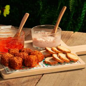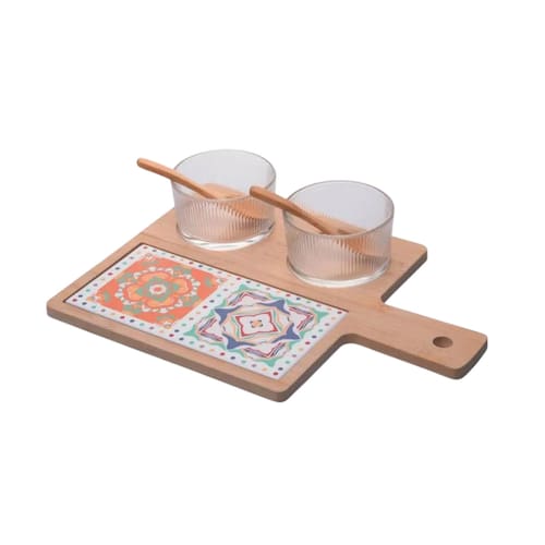 • Dimensões: Bandeja 32x22,5x0,5cm | Petisqueira Ø 8x5cm | Tábua Ladrilho 20x10x0,03cm