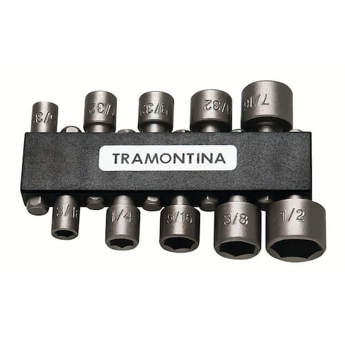 Para levar muito mais praticidade em seu dia a dia, você precisa do o Jogo de Ponteiras Tramontina Tipo Soquete 10 Peças! Todas as peças são produzidas em aço especial com encaixe universal 1/4 polegadas e possuem acabamento jateado e envernizado. Com ela, você irá apertar e afrouxar parafusos e porcas com perfil sextavado em polegadas, utilizando parafusadeiras elétricas ou à bateria. Um item versátil e prático, que conta com suporte para o armazenamento e transporte dos 10 tamanhos de ponteiras disponíveis. Você não vai deixar um conjunto completo como este escapar não é? Aproveite! Orientações Ponteiras produzidas em aço especial.Encaixe universal 1/4". Acabamento jateado e envernizado. Conteúdo:10 ponteiras sextavadas tamahos: 5/32", 3/16", 7/32", 1/4", 9/32", 5/16", 11/32", 3/8", 7/16" e 1/2". As ferramentas são produzidas e testadas conforme normas específicas. Características Gerais EAN13 7891114143508 DUN14 17891114143505 NCM 8204.20.00 Peso Líquido 0,1500 kg. Peso Bruto 0,1600 kg. Metragem 0,000243 m³. Dimensões Embalagem (Compr. X Larg. X Alt.) 150x 90x 18 mm. Dimensões Produto (Compr. X Larg. X Alt.) 150x 90x 18 mm. Observações Use óculos, luvas e outros equipamentos de proteção de acordo com a tarefa a ser executada. Mantenha ferramentas de corte longe do alcance de crianças. Respeite os valores de torque estabelecidos por norma.