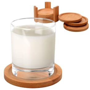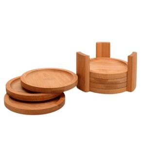 CONJUNTO: Inclui 06 porta-copos redondos e um suporte, todos feitos de bambu. São ecológicos, duráveis e reutilizáveis. Medidas dos porta-copos: C- 10cm L- 10cm A- 5mm. Medidas do suporte: C- 11cm L- 11cm A- 6,5cm, com peso total de 246 gramas.