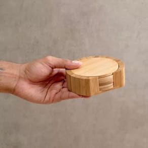 Esse é o jogo de porta copos redondo de bambu 7 peças: o jogo conta com 1 base organizadora e 6 porta copos. perfeito para receber amigos e familiares. Funcional: aguenta jarras, copos e garrafas bem quentes ou até muito geladas! Decorativo: fica bem bonito na mesa. o design moderno e o tom natural se destacam nesse jogo, que pode até fazer parte da sua decoração, deixando os ambientes mais rústicos e charmosos. Feito de bambu: material leve, resistente e ecologicamente correto. Durável e higiênico: o bambu é resistente e tem propriedades que evitam a proliferação de bactérias, só precisa lavar e secar de acordo com as recomendações, combinado? Dimensões do produto: Altura: 10Cm Largura: 7Cm Comprimento: 12Cm