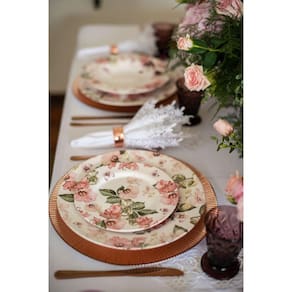 ficha técnica - fonte do produto: cerâmica alleanza - unidades por kit: 6 - tipo de prato de louça: raso - diâmetro: 28 - forma: redonda - formato de venda: kit - nome do desenho: florido - comprimento: 28 - cor: rosybrown. - material: cerâmica - utilizações seguras: microondas - cor: branco