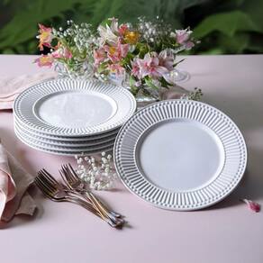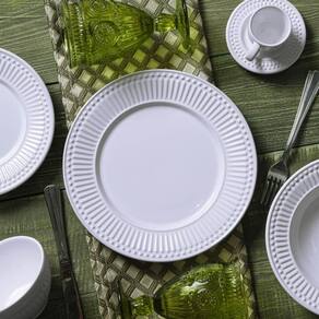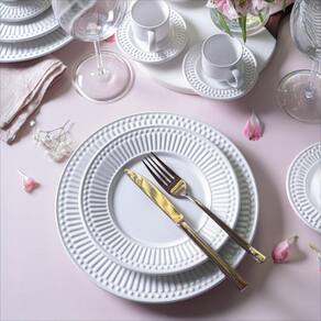 A linha Roma Branco, da coleção Ravenna, é inspirada nos relevos das colunas romanas e traduz esse clássico em uma estética de simetria suave e elegante. Com formas agradáveis e presença marcante sem exageros, a linha encanta desde o primeiro olhar e adiciona um toque atemporal à mesa, valorizando o dia a dia com charme e sofisticação. Produzida em cerâmica feldspática, oferece acabamento refinado e ótima experiência de uso, ideal para refeições cotidianas e também para receber com estilo. O conjunto é composto por 18 peças, sendo 6 pratos rasos, 6 pratos fundos e 6 pratos de sobremesa, criando uma composição completa e harmoniosa para diferentes momentos. Dimensões: prato raso 26 cm, altura 2,8 cm; prato fundo 22 cm, altura 5 cm; prato de sobremesa 20,5 cm, altura 2,7 cm. Cor predominante da base: branco.